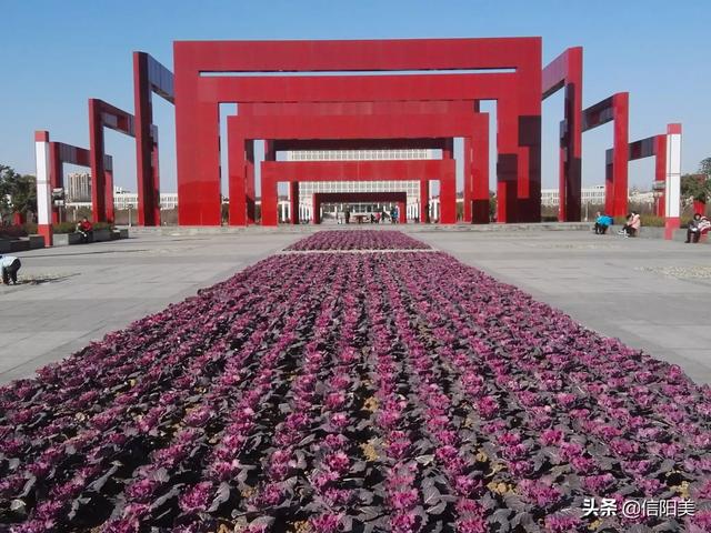 图二 百花之窗,位于羊山新区百花园中心,市政府门前。四面由四个具有强烈视觉冲击力的红色巨形窗口组成,以次推进,寓意连接时代的古今之窗。现已成为信阳名片。
