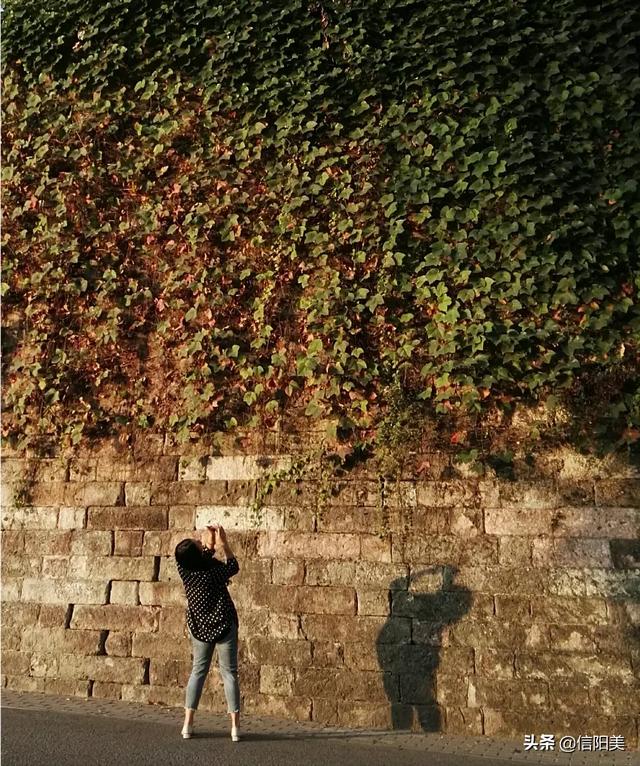 图四 老城墙,位于浉河公园西门旁。是一段由红色花岗岩垒砌的城墙,长百余米,始建于明代。有诗曰:一道城墙凝聚了多少信阳苍桑。